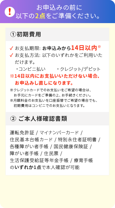 (※1)運転免許証 / マイナンバーカード / 住民基本台帳カード / 特別永住者証明書 / 各種障がい者手帳 / 国民健康保険証 / 障がい者手帳 / 住民票 / 生活保護受給証等年金手帳 / 療育手帳のいずれか1点で本人確認が可能